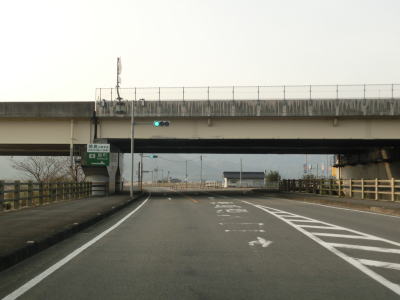 | 緩やかに左にカーブしている新岩崎橋を渡った所で香川r45岡交差点を通過する。r45の路線名は高松空港線であり、右折してr45を走ると高松空港に行く事ができる。岡交差点から約200m進むと香川r44との信号機のない交差点を通過し、さらに約500m進むとr45香南町清水交差点を通過する。香南町清水交差点でr44を100m程走るとR193・R492の現道に行く事ができる。香南町清水交差点から南下すると前方に赤色の高層建造物が見えるが、これは高松空港の誘導灯である。 | ||