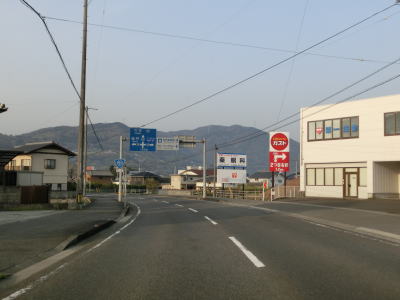 | 曽江谷川に沿って走っていると徐々に沿線の建物が増えてくるが、基本的には普通の家屋が多く商業施設は少なく賑わっている雰囲気ではない。旧脇町の中心部に差し掛かる手前で現道との交差点を通過する。ウォッちずでは国道色に塗られたままだが、案内標識におにぎりは表記されていない。現道に進んでしまうと約3.5km南の拝原交差点までしか国道に指定されてないため国道をトレースできない。よって、道なりに直進してバイパスを走らなければならない。 | ||