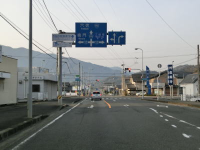 | 中新町交差点から約11kmで香川r13との川東下交差点に至る。ウォッちずでは左折の道路も国道として扱っているが、案内標識にはr13のヘキサが描かれている。現道はただの狭苦しい対面2車線道路でこれと言って特徴もないので今回は直進してバイパスを走行している。 | ||