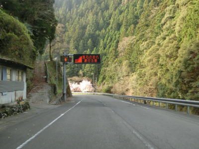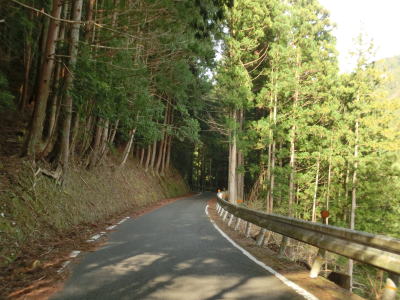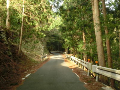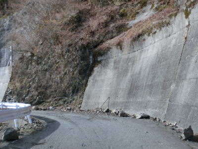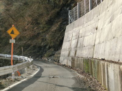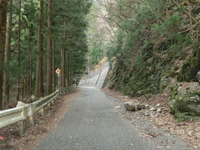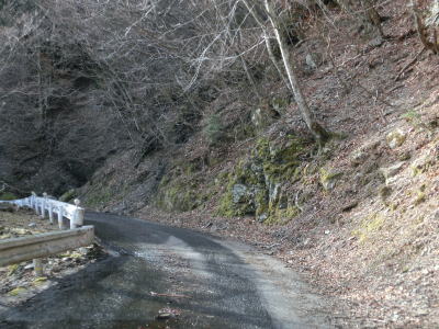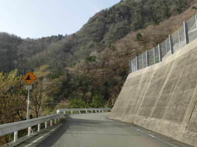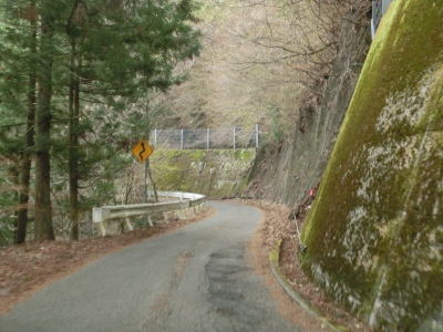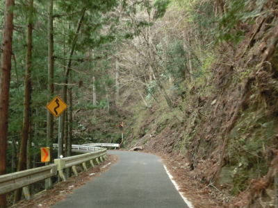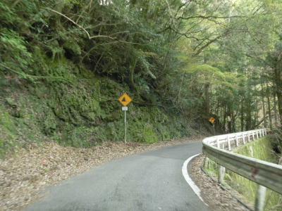 | 2ヶ所目(?)の端点を過ぎてからも1.5車線幅の山岳狭路が続いている。ヘアピンカーブはないものの急なカーブが多く見通しは悪い。つづら折れありや落石のおそれありの警戒標識がいくつも設置されているが、どちらも標識に偽りなく、カーブは多いし落石も少なからずある。 | ||