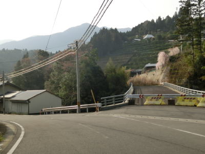 | 視界が幾分か開けた所で江田方面に向かう町道との交差点を通過する。交差点の形状がY字状のため、案内標識がなければどちらに進むべきか判断に迷うかもしれない。その後も1.0車線狭路が続くが、少し走るとセンターライン付きの2車線道路になる。蛇行する神通谷川を川又1号橋、金泉2号橋、川又3号橋、川又4号橋を次々に渡って行く。2号橋だけ金泉となっているが、銘板がそうなっており誤記ではない。72KPの直後にセンターラインがなくなる。 | ||