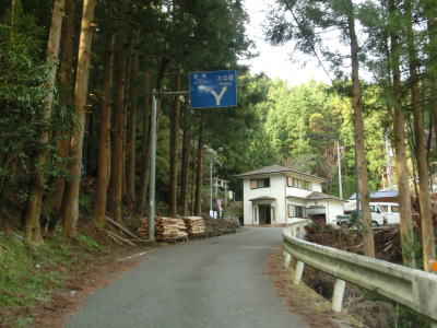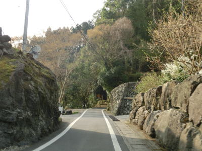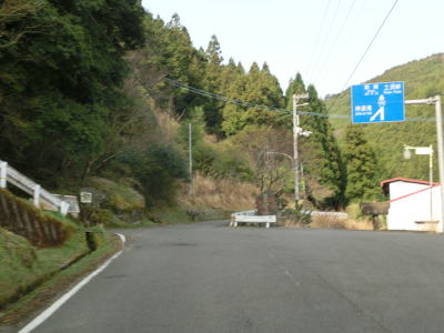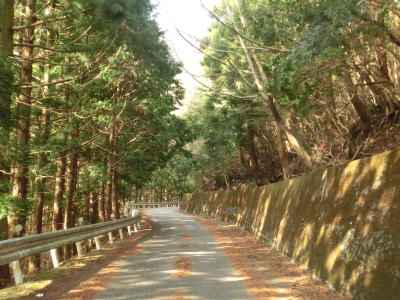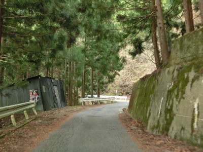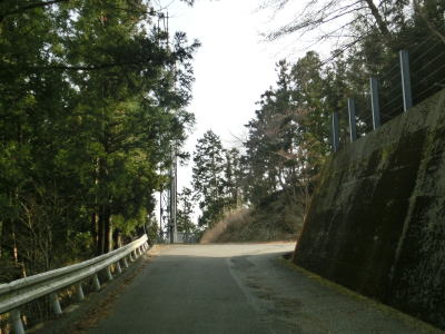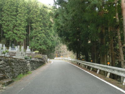 | 山間部の割に広い墓地を回り込むように左のヘアピンカーブを曲がり、程なくして右のヘアピンカーブを曲がる。その後は等高線に沿った緩やかな上り勾配の狭路を走る。大中尾の端点から約2.0km走ると左のヘアピンカーブを通過するが、スーパーマップルをはじめとする多くの地図で端点としている場所である。 | ||