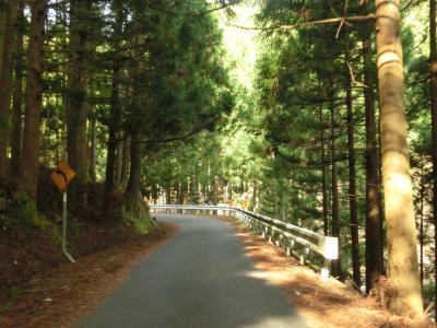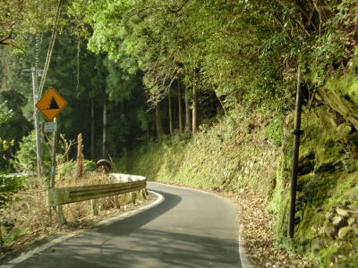 | 岳人の森を過ぎてからも上り勾配の山岳狭路が続いているが、視界が開けている割合が多くなる。そのため路面の落ち葉が堆積している場所が少なくなるが、別の物、小石が散乱している場所がいくつか見られた。 | ||