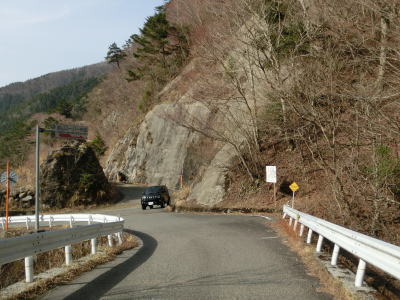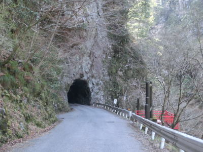 | 沢谷川の右岸を走っているが、川との高低差はだいぶ小さくなっており川の水を確認する事ができる。ガードレールが設置されていない区間も少なくないが、万が一転落しても即死は免れる可能性がある。ただし、けがで動けなくなり誰にも発見されず助けが来ずに絶命してしまう可能性はある。それほど交通量は少ない。2.0車線幅の釜ヶ谷橋を渡って左岸に移り、その後も山岳狭路を走っていると素掘りのトンネルをくぐる。さすがに舗装はされているが、それ以外はモルタルも吹き付けられていないトンネルで、延長は100m超と意外に長い。トンネルの手前には大釜の滝があり展望所が設置されているが、車を停められるスペースが路上の少し広くなっている場所にしかない。 | ||