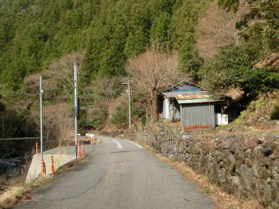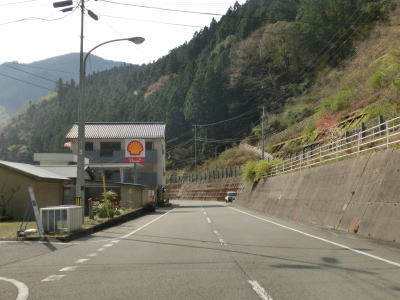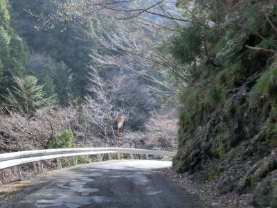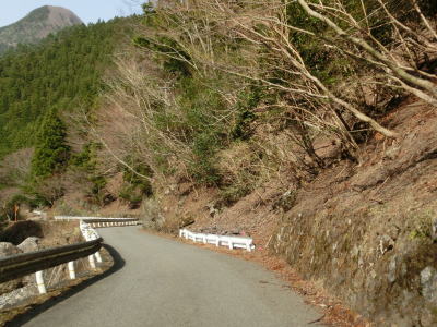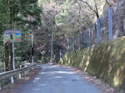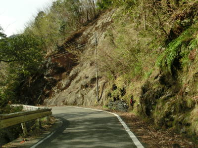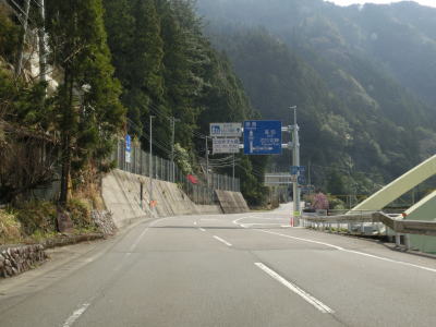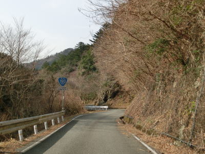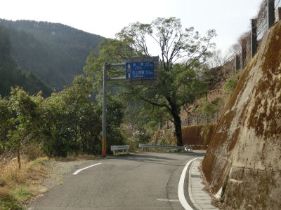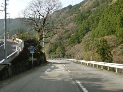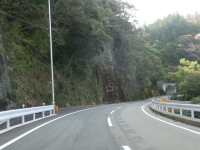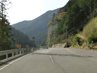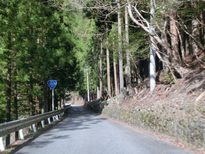 | 雲早隧道から約3.1kmでウォッちずでの端点を通過するが、こちら側の徳島r253との境目がはっきりわからない。また、ウォッちずとスーパーマップルでは2〜300m程ずれている。ウォッちずでの分断区間(r253単独区間)の距離は約11kmである。 端点らしき場所を通過してから程なくしておおつく谷橋を渡り、少し南におにぎりが立っている。補助標識には山川海南線という路線名はなく地名だけなのでそこから南は確実に国道に指定された区間だと言える。とは言ってもr253と比べて道路状況が良くなる訳でもなく狭くてカーブの多い狭路が続く。 |