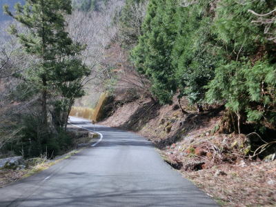 | 剣山スーパー林道との交差点を過ぎて緩やかな下り勾配の狭路を走る。道幅は決して広くないが、神山町側に比べると幾分か広く落石も少ない。おにぎりが立っている左ヘアピンカーブを曲がって少し走ると釜ヶ谷川の左岸を走るが、高低差があるため川はまだ見えない。 | ||