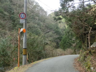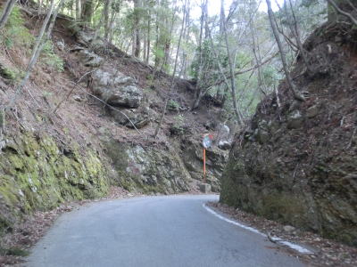 | 徳島r16交差点から程なくして2ヶ所目の対向車お知らせ区間に差し掛かる。対象区間の距離は400m弱で、1ヶ所目よりも狭い箇所の割合が多い。また、区間内にに遊歩道の階段があり、おそらく大轟の滝付近に行けると思われる。 | ||