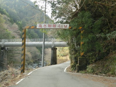 | 対向車お知らせ区間を過ぎてからも1.0〜1.5車線幅の狭路が続いている。沢谷川に沿っていくつものカーブを通過しながらほぼ平坦な道路を走っていると4.5mの制限高を警告する標識が立っている。場所が場所だけにトンネルがあると思うかもしれないが、大美谷ダム関連と思われる送水管が要因である。 | ||