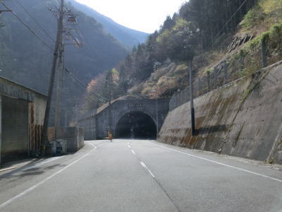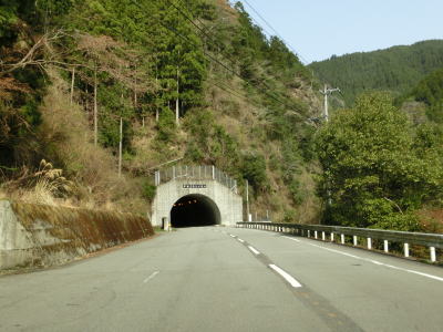 | 改良された2車線道路を走っていると五倍木大橋を渡る。その南詰には公衆トイレがあるが、比較的最近設置されたようで山間部にありながらウォッシュレット機能付きである。その後も坂州木頭川の右岸を快走していると名古ノ瀬集落を通過する。集落の規模そのものは小さいが、郵便局とガソリンスタンドがある。名古ノ瀬集落を通り過ぎた所で木沢トンネルをくぐる。内部はまず右にカーブし、出口の手前で左にカーブしている。トンネルの手前に左前方に延びている道路が旧道だが、災害による通行止の後に一部が木沢トンネルに吸収されて通り抜けできなくなっている。北進していた場合は木沢トンネルの坑口の右に素掘りのトンネルが見えるが、おそらく旧々道と思われる。 | ||