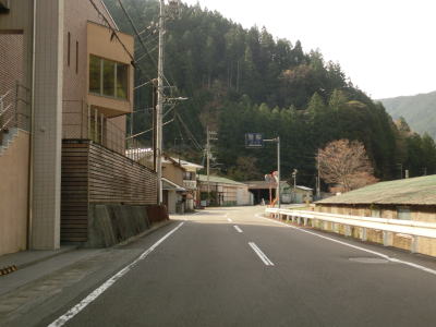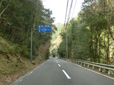 | 送水管の下をくぐってから1.5車線幅道路を緩やかに下っていると林道との交差点と徳島r16との交差点を相次いで通過する。r16には上勝としか案内されていないが、上勝町と勝浦町を経て小松島市まで行く事ができる。r16交差点付近に建物があったものの集会所と倉庫だけで普通の家屋は国道よりも林道沿いにある。またr16交差点付近に案内標識が立っており、それによると海陽町まで67kmとなっている。海陽町の役場はR55・R193大里交差点の近くにある事から海陽町までの距離がR193の残りの距離にほぼ等しい。67kmという距離はさほど長いとは言えないが、酷道区間の割合が多い事もあって思っている以上に時間がかかってしまう。 | ||
