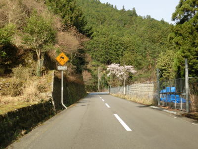 | 小剣神社と雲早神社の間で対向車お知らせ装置設置区間を通過する。この装置はセンサーにより車両の通行を感知し、対向車がある時のみ電光掲示板にその旨を点滅して表示するものである。ただ単に注意を促すために点滅しているのではないので、対向車があると表示されている場合は手前で待っていた方が良いだろう。装置間の距離は500m程度だが、これまでに比べて特別狭い訳ではなく、この程度の道路状況であれば既に何ヶ所も通過している。 | ||