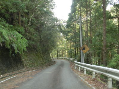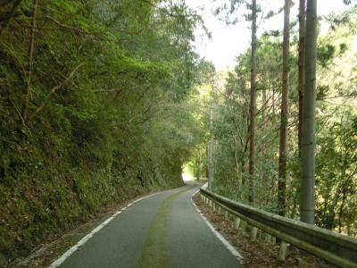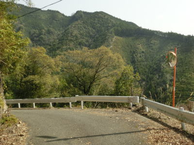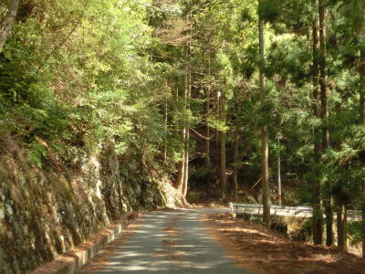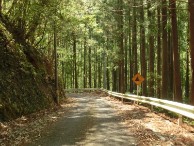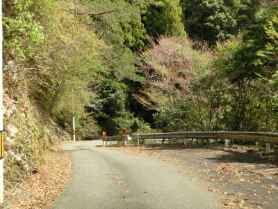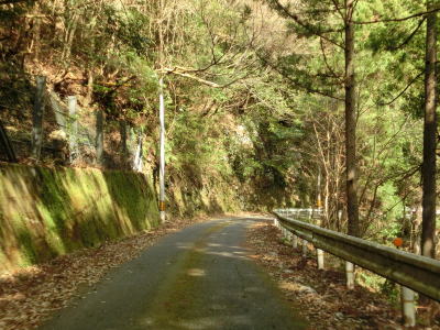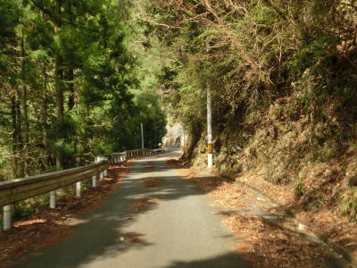 | 霧越峠を越えても引き続き下り勾配の狭路が続いているが、路上、特に路肩付近の落ち葉の堆積が多くなる。舗装された部分は1.5車線程度あるが、堆積物のおかげで実質的には1.0車線分しか利用できない。所々に少し広くなっている退避スペースがあるので対向車がいてもタイミングがよほど悪くなければ離合できるだろう。もっとも交通量は少なく、対向車は滅多に現れないだろう。 | ||