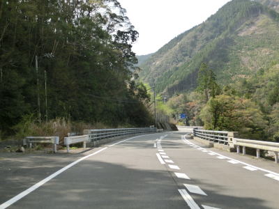 | 小規模な荒瀬集落を通り過ぎてカーブの多い1.5車線幅狭路を走る。右の急カーブを曲がった先でセンターラインが現れて2車線道路になり、平橋を渡る。山寄りの道路が旧道だが、開通後4年程度しか経過していないが閉鎖されており通行できない。 | ||