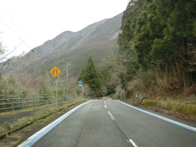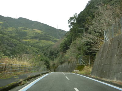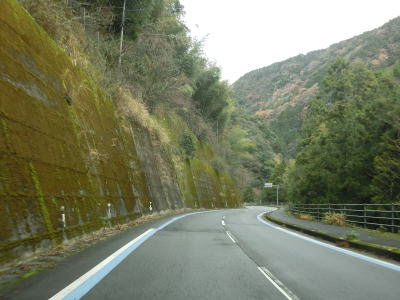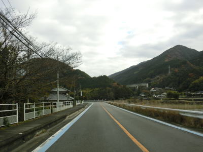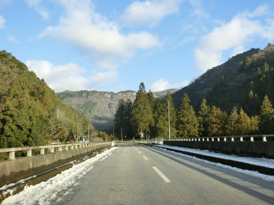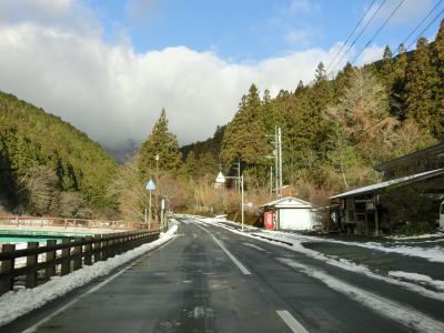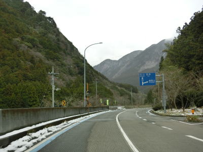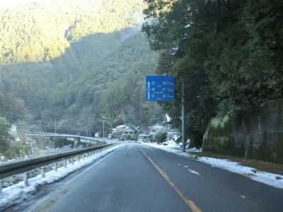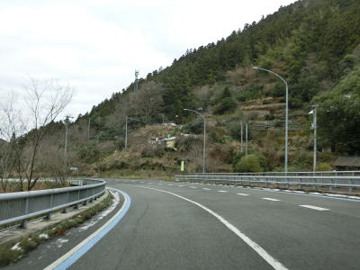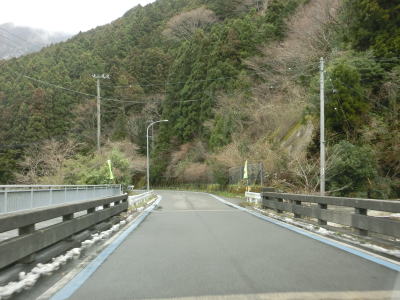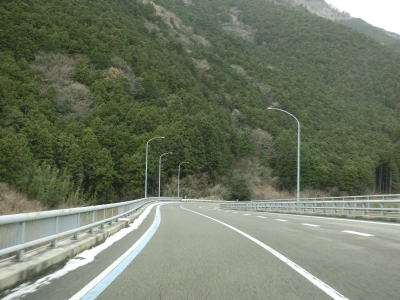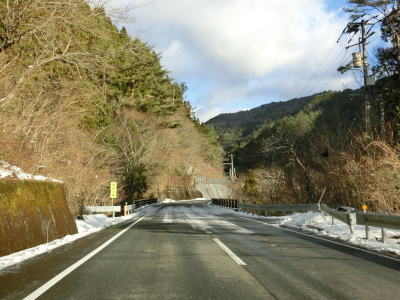 | 谷川に沿った緩やかな勾配の2車線道路を下り続ける。高知県側で積雪していたせいもあったか、交通量は非常に少なかった。荒川橋と東宮橋を相次いで渡ってからは加茂川沿いとなり、勾配がさらに緩やかになる。 | ||