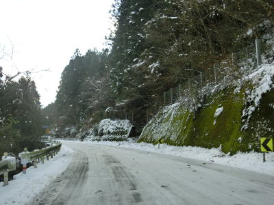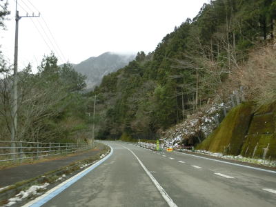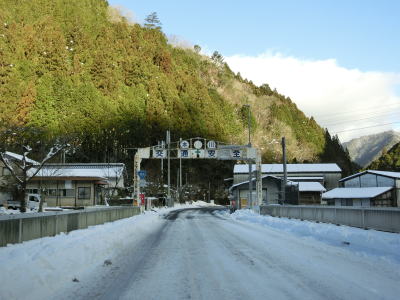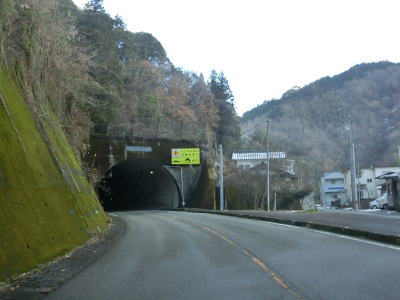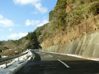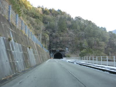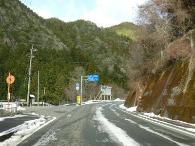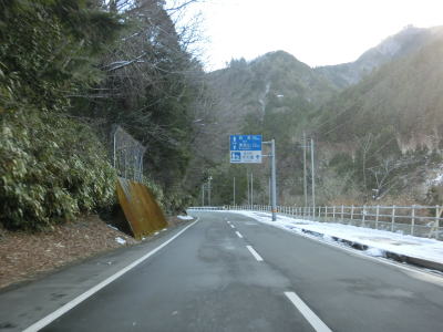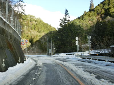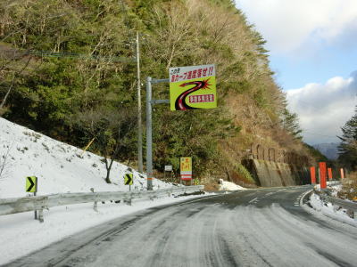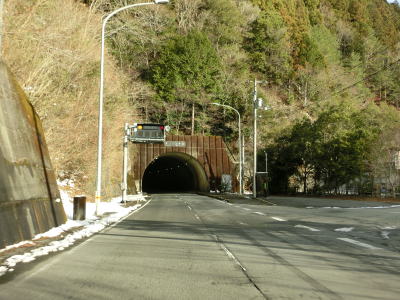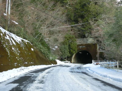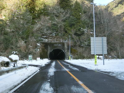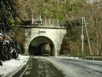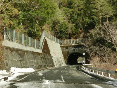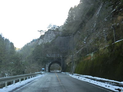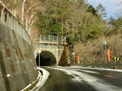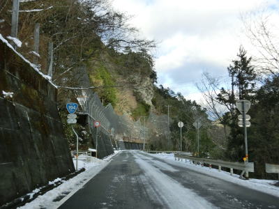 | ゆずり車線が終わって対面2車線道路に戻ってからは比較的日当たりが良いため路面の雪は少なかったが、日影や橋上にはまだ残っていた。やや急なカーブをいくつか曲がった後に枝畝トンネルをくぐる。トンネルの手前に旧道らしき道路が交差しているが、大森隧道が閉鎖されているため通り抜ける事はできない。 | ||