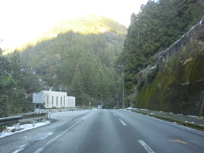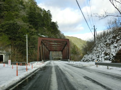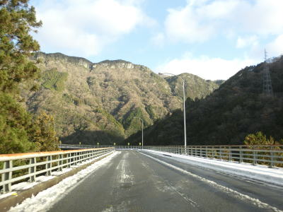 | 全体的に日当たりが悪く積雪している2車線道路を走っていると分水第一発電所の取水堰提の傍で立橋トンネルをくぐる。旧本川村の中心部に向かう旧道らしき町道との交差点の直後に長沢1の橋を渡り、次いでカーブしている長沢2の橋を渡って高知r40交差点を通過する。長沢1の橋は大森川に架かっているが、長沢2の橋は本流の吉野川に架かっている。 | ||