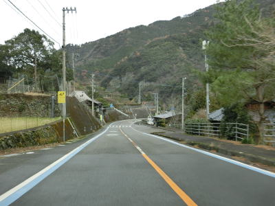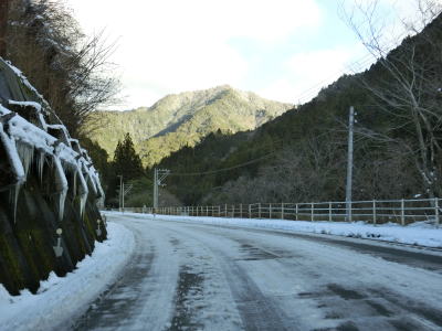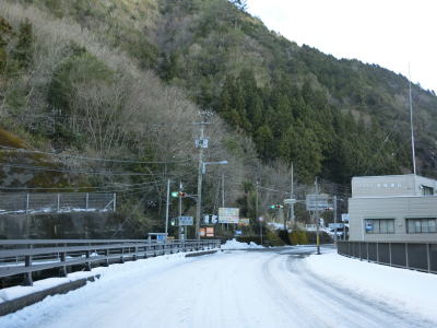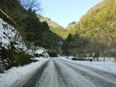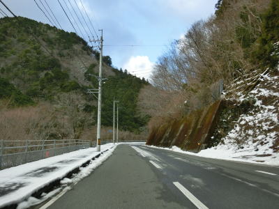 | つばやぶトンネルを出て少し走ると土居大橋を渡る。蛇行する枝川川を2回渡っているため橋の前後とも右岸となっている。橋の途中に階段が設置されているが、清水第一小学校に降りる事ができる。ただし、同校は2011年に吾北小学校に統合される形で廃校となっている。 枝川川の右岸を北上していると程野の滝(グリーンパーク)やにこ淵に至る林道(?)との交差点を通過する。枝川川沿いは林道が引き続き、R194は川から徐々に離れていく。左カーブを曲がると南側に山があって日当たりが悪いため路面の雪が融けずにかなり残っていた。右のヘアピンカーブを曲がると南側の山と離れるため路面の雪も少なくなる。 |