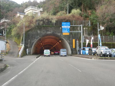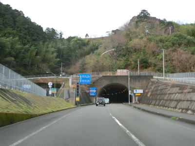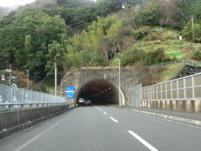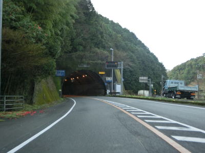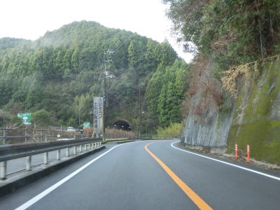 | よさこいトンネルの坑口付近からは緩やかながら上り勾配が続く。やや薄暗い谷筋を走っていると名古屋トンネルをくぐって須崎市に入る。左側に名古屋隧道が視認できるが閉鎖されており進入できない。1.0車線幅狭路の旧々道に名古屋隧道があるが、こちらはどちら側の坑口付近にも家屋があるためか現在も通行可能のようである。 | ||
