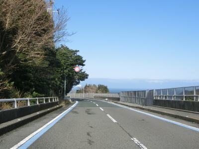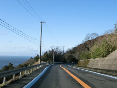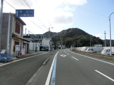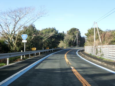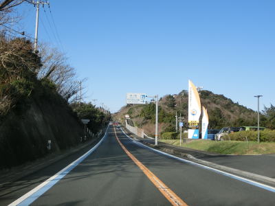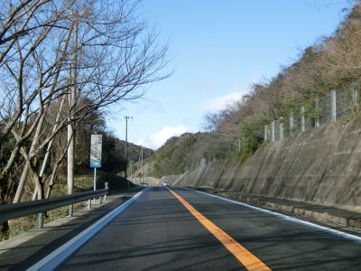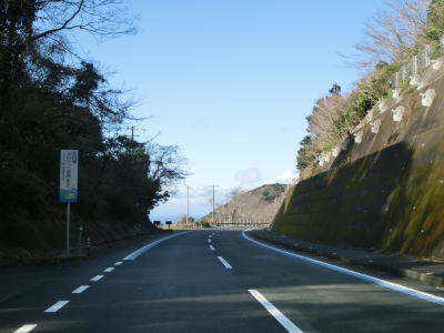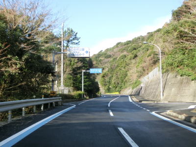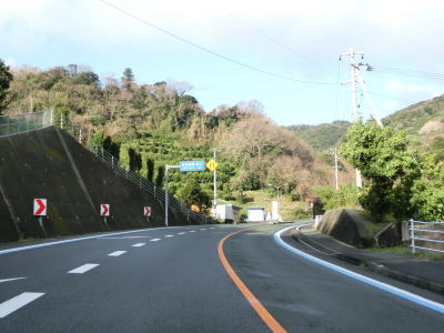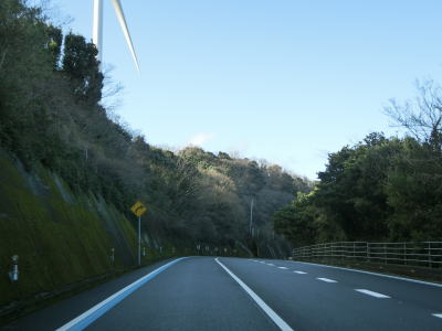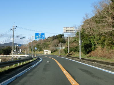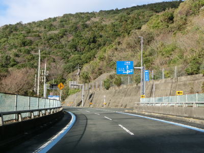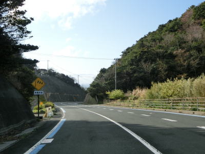 | 九町第二トンネルを出てすぐに登坂車線が設置されているが、ここの延長は200m強と長くない。登坂車線が終わった後に町道との交差点を通過するが、この町道は四国電力の伊方原子力発電所の出入口に至る道路のひとつである。その交差点のすぐ先に道の駅「伊方きらら館」がある。原子力発電所のPR館の伊方ビジターハウスもあり道の駅に隣接している。 道の駅からはアップダウンしている2車線道路を走る。急なカーブもなく非常に走りやすい道路状況である。横風注意の警戒標識が設置されており、樹木に視界を遮られているため分かりにくいが細長い半島の尾根に近い場所を通っているため風を遮るものが少ないため強風の影響を受けやすい場所である。 |