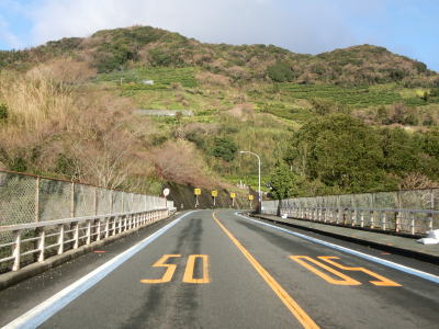 | R378交差点を過ぎてからも上り勾配が続いている。勾配は7%とややきつく、左カーブの先に延長200m程度と短い登坂車線が設置されている。登坂車線が終わってからも上り勾配が続いている。保内交通検問所の前を通ってから保内大橋を渡る。欄干に加えてフェンスが取り付けられているが、これは下にみかん畑があるためだろう。 | ||