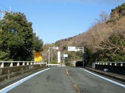 | 川永田第二橋で町道の上を通て九町トンネルに入る。橋上からは前方の山の向こう側に伊方ウィンドファームの風車が見える。佐田岬半島は風が強いため中央部の尾根の複数の場所に複数の風車が建てられている。九町トンネルを出て九町集落への町道との交差点を通過して複数の橋を渡った後に九町第二トンネルをくぐる。 | ||