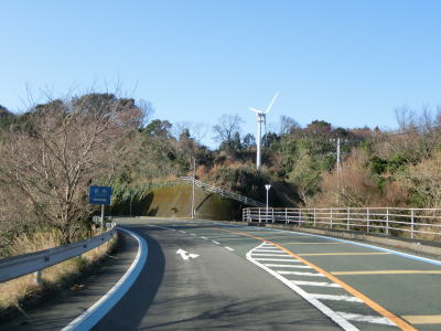 | 堀切大橋からの勾配を上っていると塩成第一トンネルをくぐる。尾根に建つ瀬戸ウインドヒル発電所の風車群を見ながら緩やかな勾配を下っていると塩成第二トンネルをくぐる。 | ||