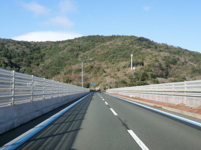 | 大久トンネルからは勾配が少しきつくなる。大森山を回り込むようなルートで走っていると伊予灘が見える。上りとなる反対側車線に約900mの登坂車線が設置されており、その区間は横風ならぬ突風に注意する必要がある。登坂車線区間の後半は宇和海が見える。伊予灘、宇和海ともには瀬戸内海の一部ではあるが、佐田岬半島の北側の伊予灘と南側の宇和海とに分けられている。 | ||