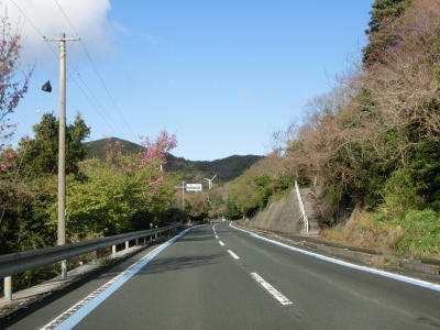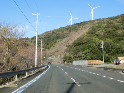 | 伊方町風力発電所付近は道路の両側の方が高いが強風が吹く地域という事で横風に注意が必要なようである。あまり峠に見えないがウオッちずで平石峠と記されている場所で町道との交差点を通過する。緩やかなカーブが連続する2車線道路を快走していると佐市集落に向かう町道との交差点を通過する。交差点の脇には低い風車があるが、ストリートビューを見る限りは比較的最近建てられたもののようである。 | ||