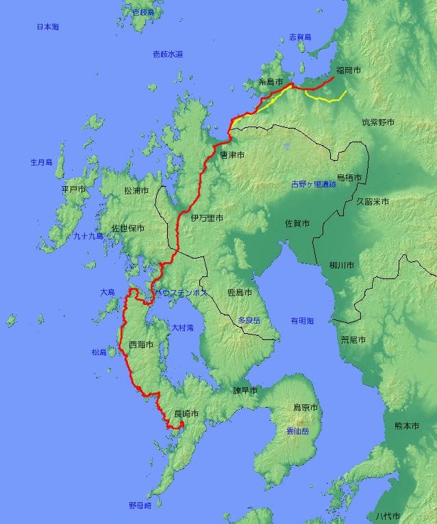 | 主な経由地 | 福岡県福岡市〜糸島市〜 〜佐賀県唐津市〜伊万里市〜有田町〜 〜長崎県佐世保市〜西海市〜長崎市 |