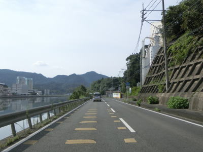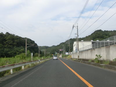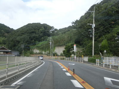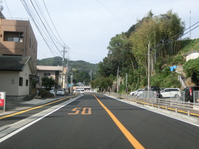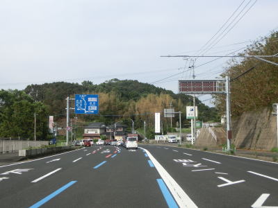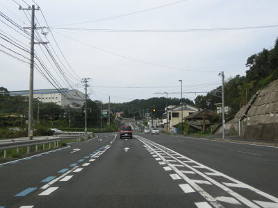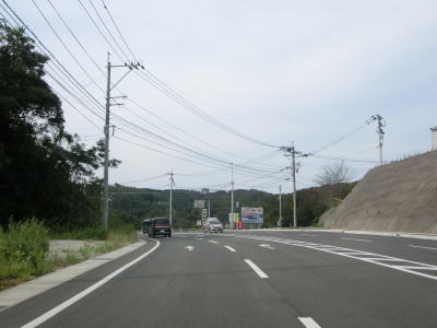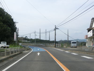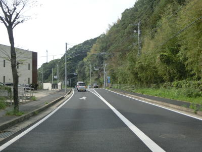 | 緩やかな勾配を上り切った所で市道との交差点を通過するが、ここで右側車線が市道への右折専用車線になってしまう。この市道の行き先のひとつに浦頭ふ頭クルーズターミナルがあり、その名の通りクルーズ船の専用ふ頭である。元々は2020年4月に開業する予定だったが、社会情勢により遅れて8月になったもよう。 対面2車線道路に戻ってからはアップダウンとカーブを繰り返すようになる。メインルートは西海パールラインのためか交通量は少ない。前方に3本の塔が見えるが、これは針尾送信所の電波塔で高さは136mで自立式電波塔では日本で最も古い(現在は電波塔としては機能していない)。 |