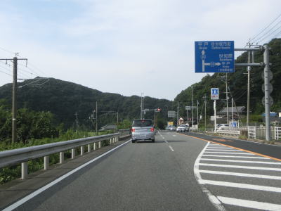 | 伊万里口交差点からはR35との重複区間となりJR佐世保線と並走しながら南に向かって走る。二桁国道との重複区間とあって交通量は増大するが渋滞する程ではない。名もなき峠を越えると長崎県佐世保市に入る。峠の前後にも家屋が建っており峠自体が緩やかなので県境の雰囲気は薄い。長崎県に入ってからも引き続き佐世保線と隣接した状態で並走しながら緩やかな勾配を下って行く。 | ||