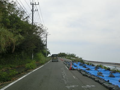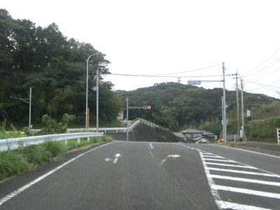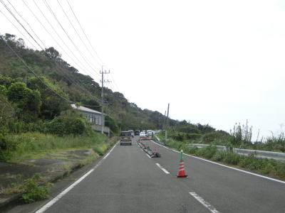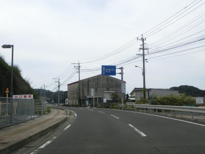 | 神浦港を過ぎた直後に新神浦橋を渡り、南詰で長崎r57交差点を通過する。上流に架かっている神浦橋が旧道と思われる。新神浦橋を渡り終えてからは下り勾配となるが標高2,30m以上はある。2週間ほど前に台風10号が九州西部を直撃しており、その際に崩れたと思われる箇所がいくつかあり交互通行規制が敷かれていた。 | ||