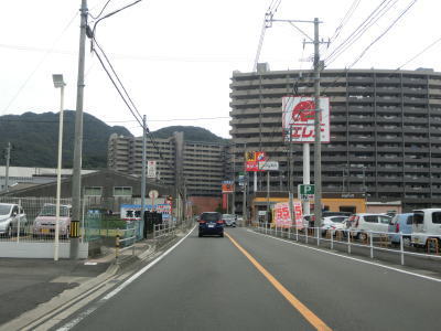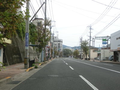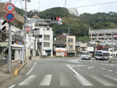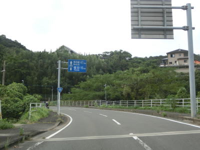 | 福崎霊園付近からは海から少し離れた場所を走り、霊園を過ぎると下り勾配となる。左のヘアピンカーブを曲がるが、カーブの途中に海の駅「長崎サンセットマリーナ」に至る市道が接続している。長崎市の中心部に近付いているため、交通量が増えるとともに沿線には商業施設の他にそこそこの規模のマンションも見られるようになる。 | ||