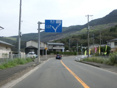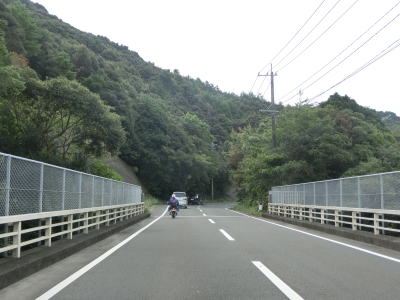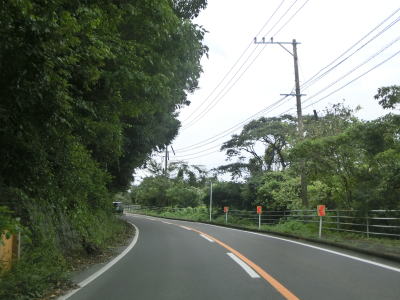 | 歩道部分にベンチや植栽のある新小江橋を渡ってから市道が交差している右ヘアピンカーブを曲がる。小江町集落を過ぎると勾配を上って標高を少しだけ上げる。海に近い場所を走っているものの樹木に視界を遮られて海が見えない。 | ||