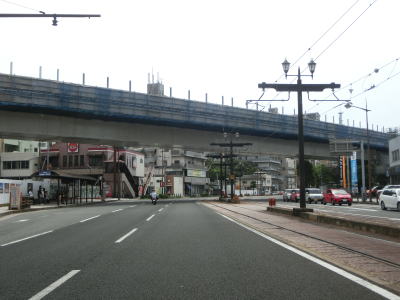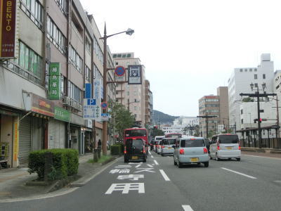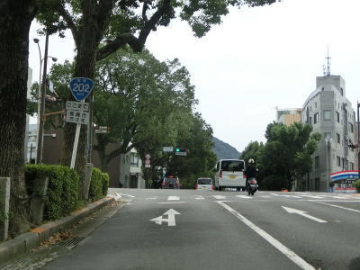 | 旭大橋東口交差点からも長崎電気軌道を挟んだ片側3車線道路が続いている。五島町交差点からは左端車線がバスと2輪車の専用車線(日曜・休日を除く7-9時)になる。大波止電停を挟んだR206・R324・R499・長崎r112大波止交差点を左折して茂木方面に進む。R324とR499はこの交差点が起点であり、R499は南の野母崎方面へ、R324はR206ともに東の茂木方面のR202に重複している。なお、R324もR499も海上区間を持つ国道である。前者にはフェリーが就航していたが、2013年10月からは高速船に代わっている。後者には航路そのものが存在しない。 | ||