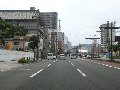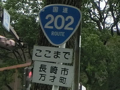 | 大波止交差点からは路面電車のない普通の4車線道路になる。緩やかな勾配を上った先のR34・R57・R206・R251・R324江戸町交差点がR202の終点である。福岡県福岡市の起点からの距離は200km近く、かなり長大な国道である。案内標識にはR34とR324しか表記されていないが、東はR202・R206・R324重複区間、北はR34・R251重複区間、東はR324単独区間となっている。R324を除いて起点もしくは終点となっている(R34とR57は起点、R202とR206、R251は終点)。また、かつては県庁前交差点という名称だったが、2018年1月に長崎県庁が移転したため交差点やバス停の名称が変更されている。 | ||