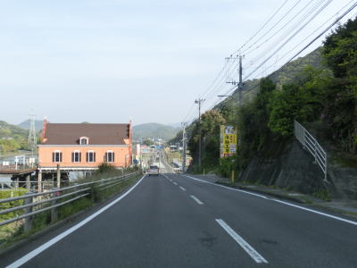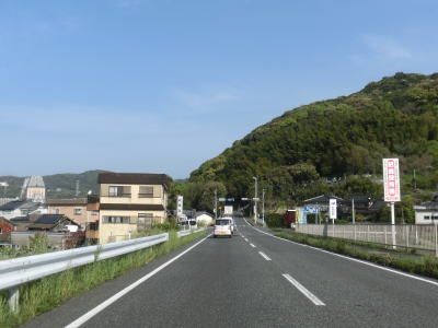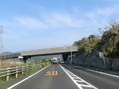 | 海沿いながら小刻みにアップダウンしており緩やかながらカーブも多い状態が続いている。江頭交差点から約5.9km走ると町境を通過して川棚町に入る。川棚町に入ってすぐに跨道橋の下を通過するが、これは市道のものである。町境直後の交差点を右折すると跨道橋を経て川棚港に行く事ができる。 | ||