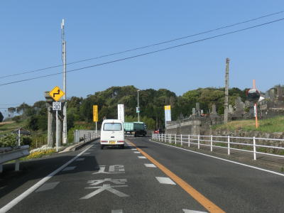 | 早岐瀬戸に架かる新早岐瀬戸大橋を渡って針尾島に上陸する。と言っても早岐瀬戸が狭いため島という印象は持ちにくい。新早岐瀬戸大橋を渡り終えてすぐに上下線が分離して片側1車線となる。中央にはかつての道路跡が残っているが、江上交差点の立体交差化に伴って付け替えられているのだと思われる。5.5%の勾配を下っているとR202・R206江上交差点に至る。R202、R205ともに交通量が多く流れの悪い交差点であり。それ故に立体交差化工事が進められているのだろう。 | ||