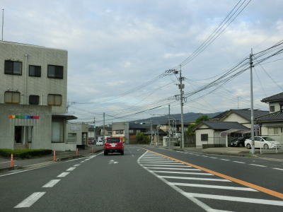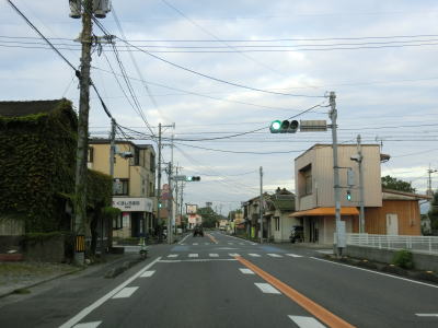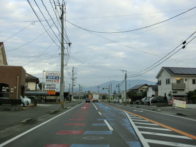| 佐賀r227白石町役場入口交差点を通過する。町境からさほど進んでいないがこの辺りが白石町の中心部である。歩道側に白色の破線が引かれているが、車道と二輪・軽車両通行帯を分けるラインである。白石町の中心部の約1.0kmに二輪・軽車両通行帯が設置されている。普通の対面2車線道路に戻ってからも平坦でカーブ少ない道路状況が続いており概ね走りやすい。 | ||