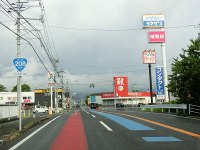 | 国鉄佐賀線跡の佐賀r401と並走しながら北西の方角に向かって走っていると佐賀r266・r285光法交差点を通過する。平坦な直線道路だが、佐賀平野の特徴のクリークを渡る箇所がいくつもあり橋の前後に短い勾配がある。佐賀市街地の南東で市道との新郷本町交差点を通過する。北に延びる市道は片側2車線道路であり、R208の路面は直線は赤色、右折は青色の薄層舗装が施されている。 | ||