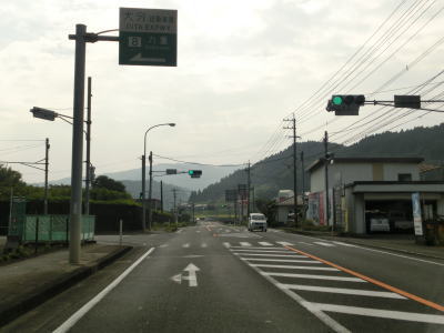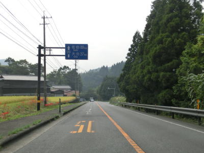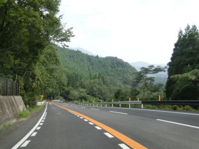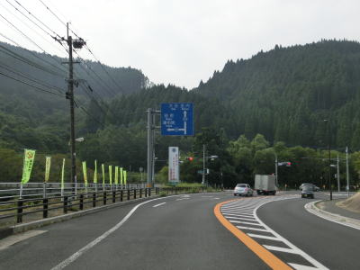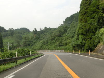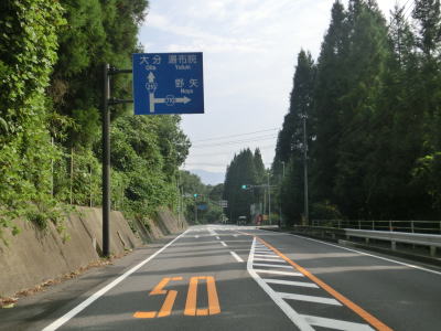 | 尾本トンネルからはアップダウンしているが交通量が少ない快走できる道路状況である点に変化はない。JR久大本線とともに野上川の右岸に移っても快走路が続く。すぐ北に大分道も並走しているのだが、国道からは視認できない。 谷に架かる2本の橋を通過した後に左にカーブするが、以降は野上川の支流の平家川沿いを走る。大分r710野矢交差点を通過するが、そのほぼ真北に大分道の水分PAがある。その後は水分峠に向かって上り勾配が続いているが、上りとなる大分方面車線のみ追越しのための右側部分はみ出し通行が可能である。 |