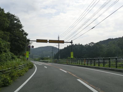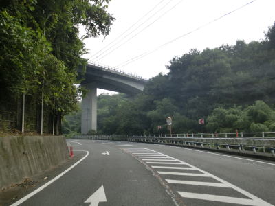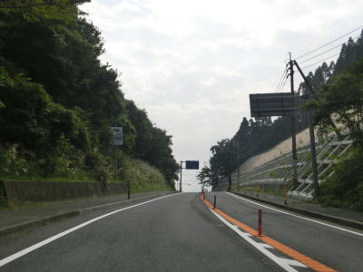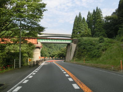 | 左カーブを曲がっていると大分道の小平谷川橋の下を通過する。これまで並走し、インターチェンジも近接していた大分道だが、交差するのは初めてである。ただし、高低差があるせいか、場所の問題か、インターチェンジは設置されていない。 大分道を過ぎてすぐに車高検知装置を通過する。制限高4mという数字は日田市にあった加々鶴隧道と同じである。やや急なカーブを連続して通過し、小平谷集落を通り過ぎた所で登坂車線が現れる。案内上は登坂車線となっているが、右側に車線が付加され、付加された車線がなくなる事から追越し車線と言った方がしっくりくる。 |