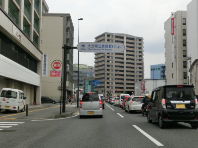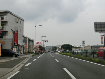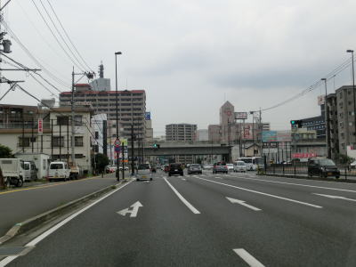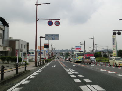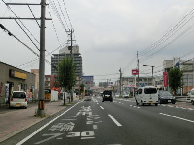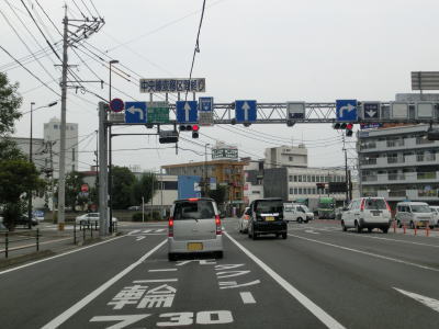 | 大道トンネルを出て緩やかな勾配を下っていると反対側車線と合流し、緩やかな左カーブの先で大分r21椎迫入口交差点を通過する。この交差点で中央線変移区間が終わる。右折車線は2本設けられており、件の変移する車線はこの交差点の右折車線の延長と考えた方が良いのかもしれない。 椎迫入口交差点からは北向き3車線+南向き2車線道路となるが、中央線は変移しない。大分市の中心部に近付いており沿線には建物が密集しており、当然ながら交通量も非常に多い。 |