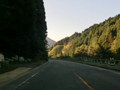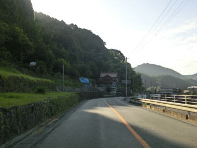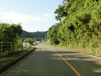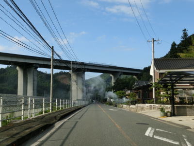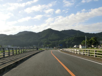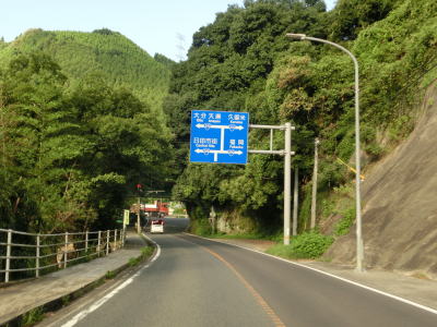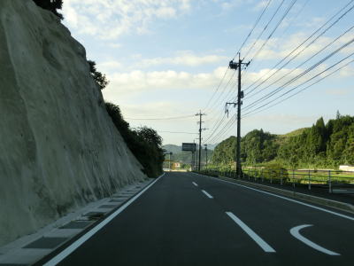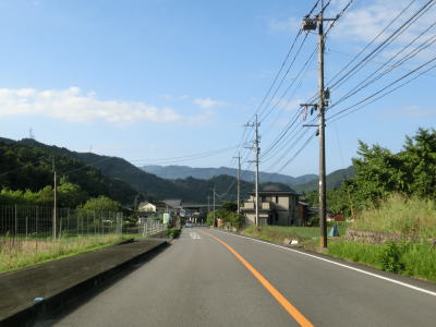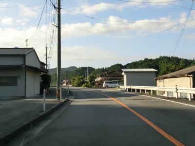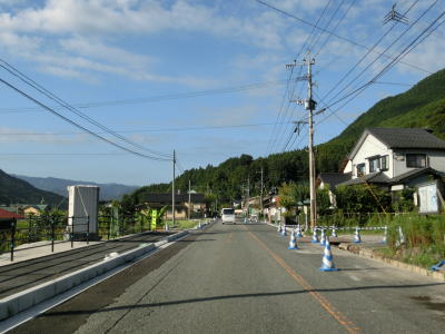 | その後も大肥川の右岸の山裾を走っており、ほぼ平坦な2車線道路となっている。道路工事をしている箇所を通過したが、歩道設置工事と思われる。対岸にはJR日田彦山線が並走しており、集落も途切れる事なく続いている。 | ||