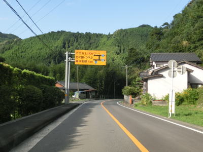 | 鼓川橋から程なくして福岡r52塔の元交差点を左にカーブするようにして通過する。鼓川橋から南の区間は西側の山に市村境があり朝倉市域に近接している場所を通っている。塔の元交差点のすぐ南に東峰村の境標識が立てられている。その場所自体は東峰村域だが、r52から走ってきた車両が東峰村に入った事を確認できるように設置されているのだろう。2ヶ所目の法面崩落箇所を通過しながら緩やかな下り勾配の2車線道路を走り続ける。 | ||
