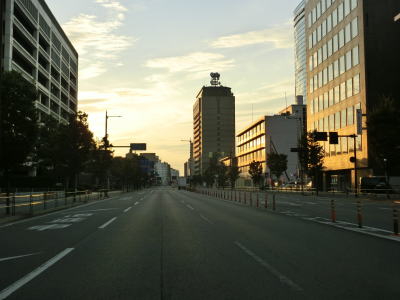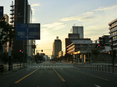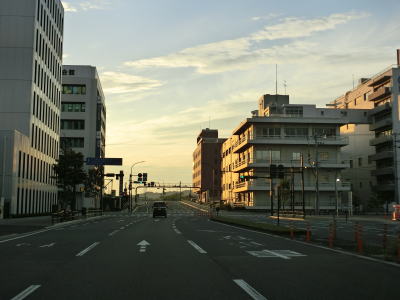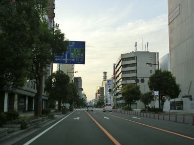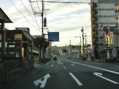 | 大分市役所前交差点からも片側3車線道路に見えるが、左端車線は大分城址公園前交差点の右折車線である。“左折”車線の誤記ではない。大型バスと二輪車のみが対象で専用の信号機に従って直進車線を跨いで右折する。大分城址公園前交差点からも片側3車線道路が続くものの約700m先の農業会館南交差点で今度は右端車線が右折専用車線になる。片側2車線道路になると同時に緩やかな勾配を上って舞鶴橋を渡る。 | ||
