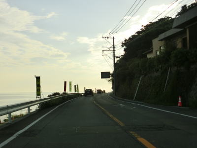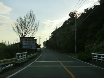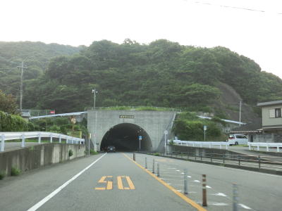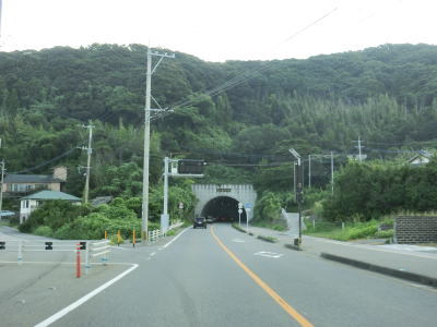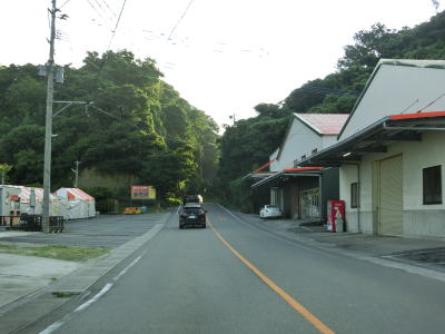 | 海岸線沿いを走っていると道の駅「佐賀関」を通過する。道の駅の建屋の手前、大分市街地寄りに第二駐車場があり第一駐車場とは専用の通路が繋がっているが、第一駐車場から第二駐車場への一方通行である。よって第二駐車場に入ってから第一駐車場に車両で移動する事はできない。この通路はおそらく日本鉱業佐賀関線跡が転用されたと思われる。 道の駅からは交通量が増える。夏休み期間中という事もあって佐賀関港からフェリーに乗船する車両が道の駅で休憩していたものと推測される。やや急な右カーブを曲がって浜集落に入るが、その手前で佐賀関線が交差していた。 |