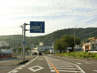 | 日本鉱業佐賀関線跡から離れてすぐに旧道との交差点を通過する。その後は鉄道跡と海に挟まれた間を走る。三崎港と佐賀関港を結ぶフェリーが案内されているが、両港を結ぶフェリーはR197の海上区間である。 | ||