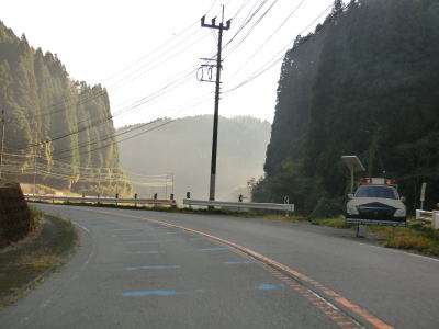 | R218にはパトカーのイラストが描かれた板が設置されているが、ただの絵ではなくパトランプとグリル部の赤色のLEDが点滅する機能を備えている。確かに線形が良く交通量も多くないため速度が出やすい状況である。旧道と思われる町道との交差点を通過してやや急な左カーブを曲がっていると牧野トンネルをくぐる。 | ||