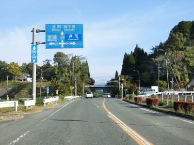 | 滝上交差点を過ぎて右カーブを曲がると直線道路を下り、蘇陽橋を渡ると上り勾配に転じる。下を流れている五ケ瀬川はこれまでの河川が有明海(東シナ海)に流れるとは異なり太平洋へと流れる。 滝上交差点から約700mでR265・R327・R503馬見原交差点を通過して延岡・高千穂方面に進む。ここでR265が椎葉方面に分岐するがR503との重複は続く。R327はこの交差点が終点で、R265椎葉方面に重複している。なお、R265椎葉方面は九州でも屈指の酷道区間が待ち受けている。 |